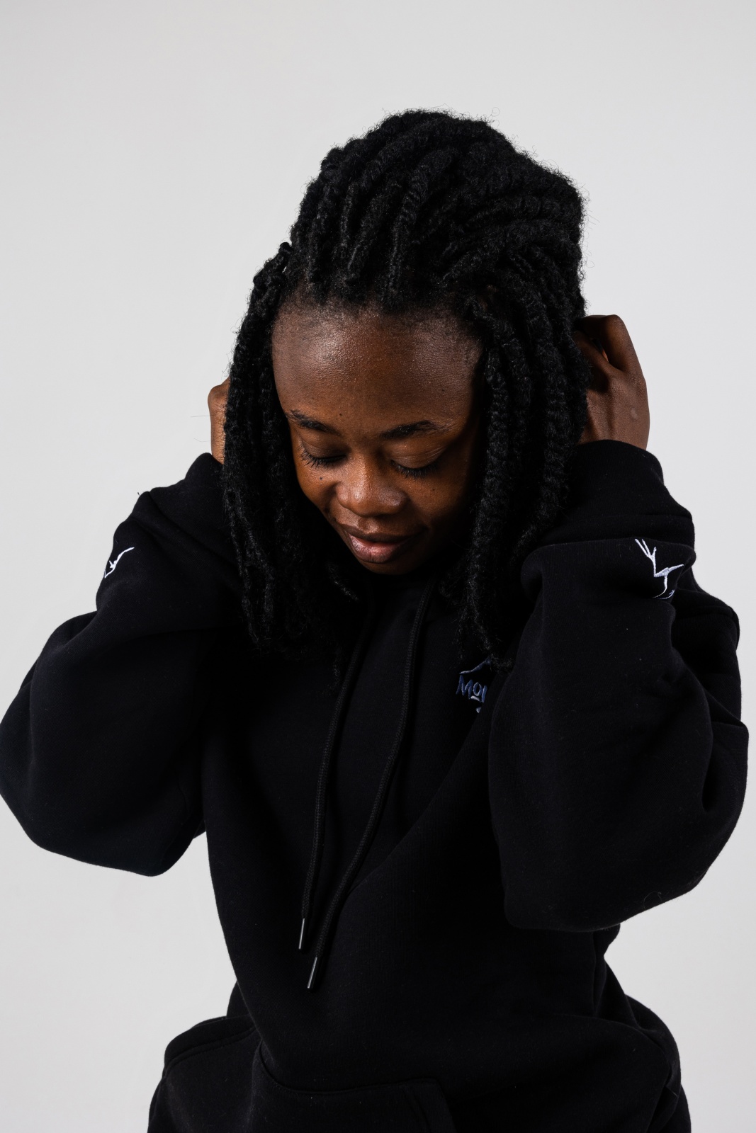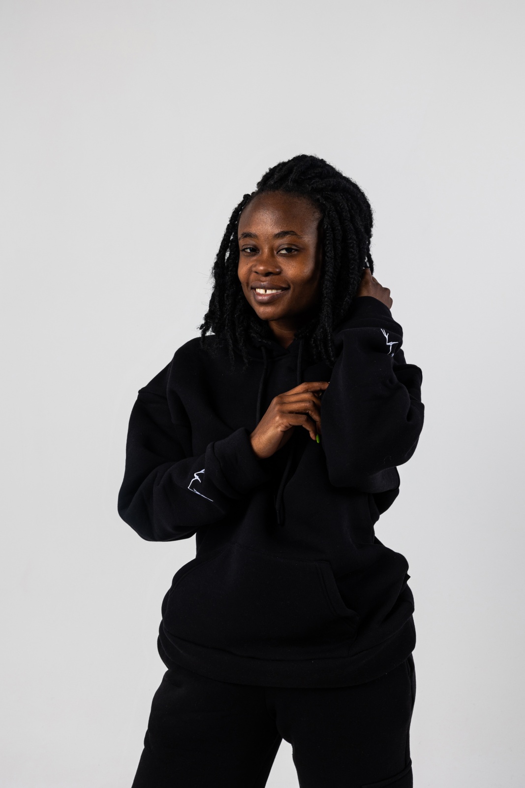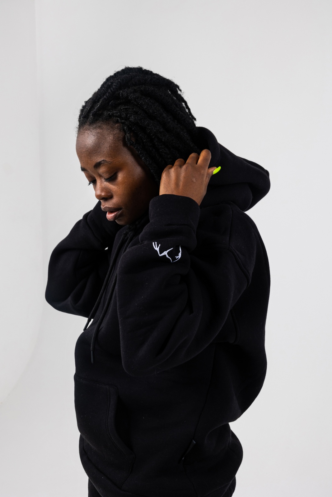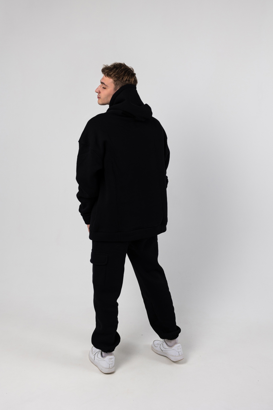 - Свободный силуэт: oversize-крой, спущенное плечо и просторный капюшон обеспечивают расслабленную посадку без ограничений в движении.